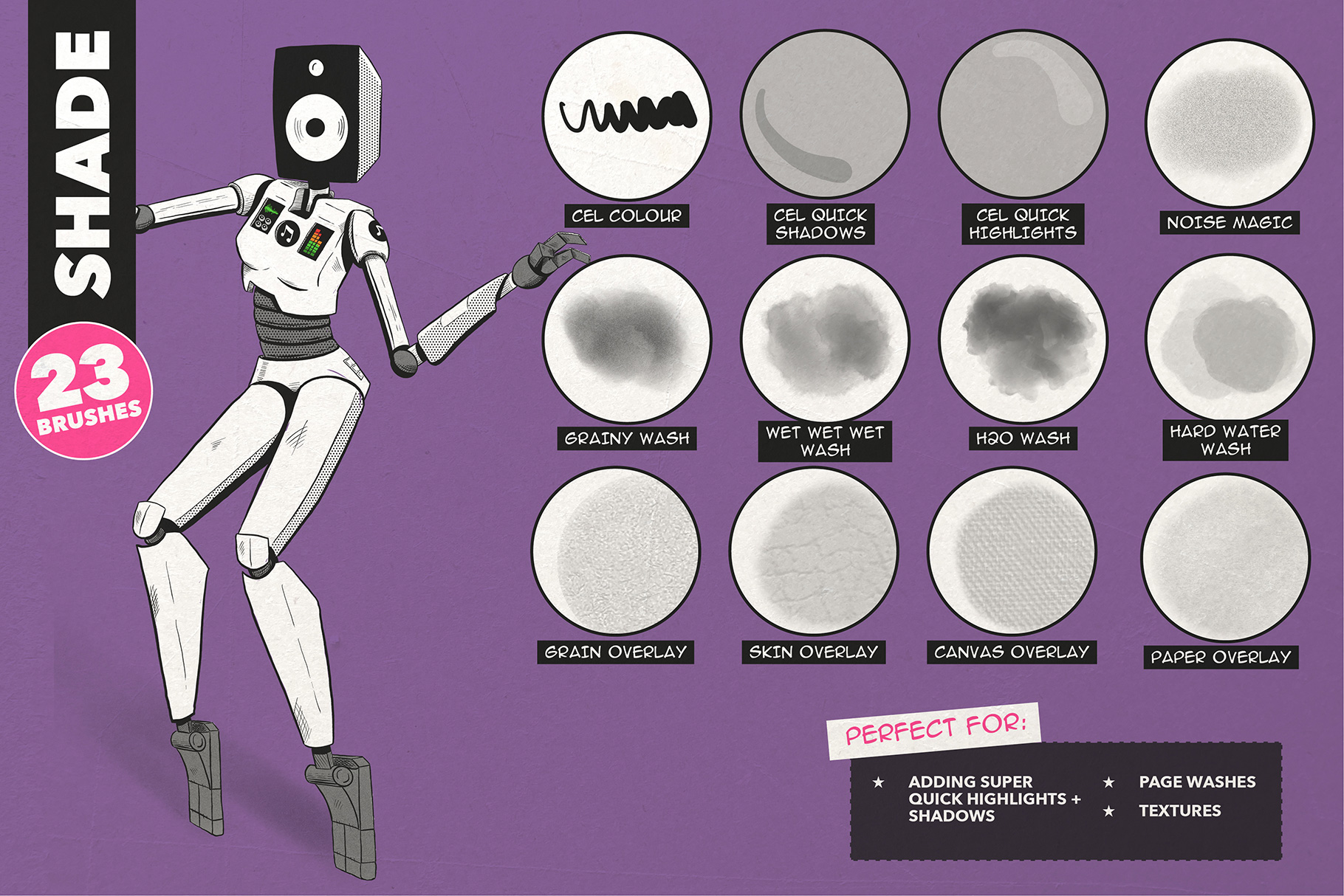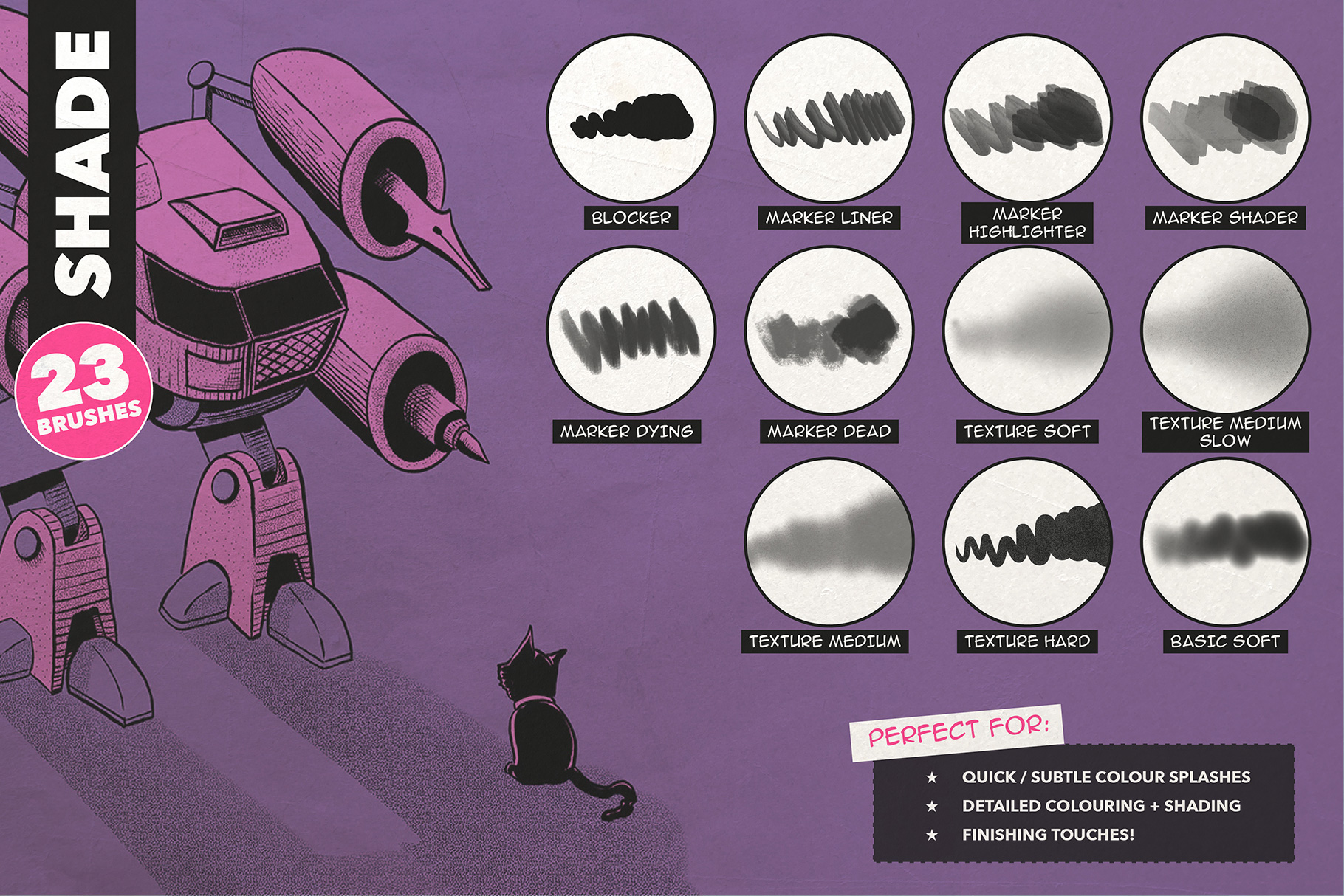 A diverse set of brushes for colouring and shading, including blockers, markers, cel shaders, loads of texture brushes, watercolour-style washes, noise and even full overlay textures (no need to import external files for these, just paint the textures straight in!)