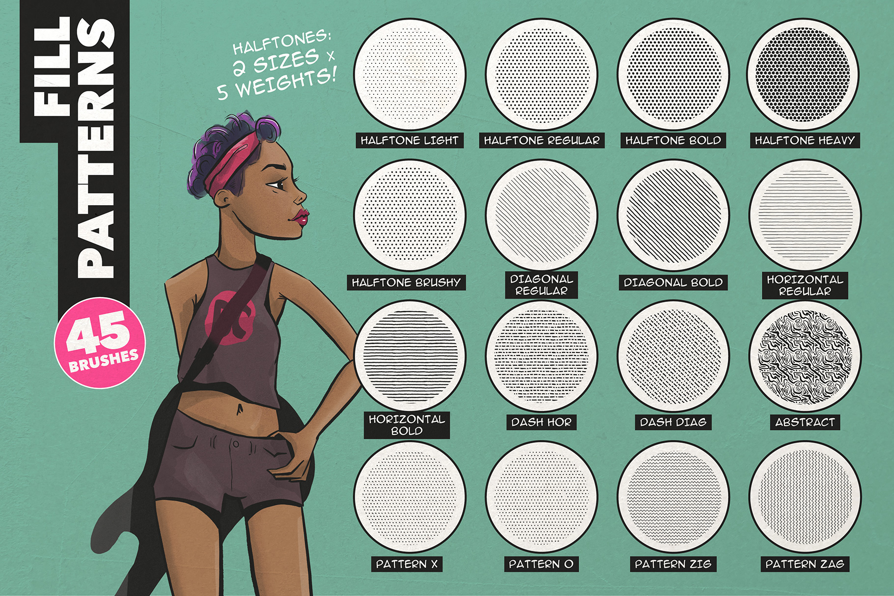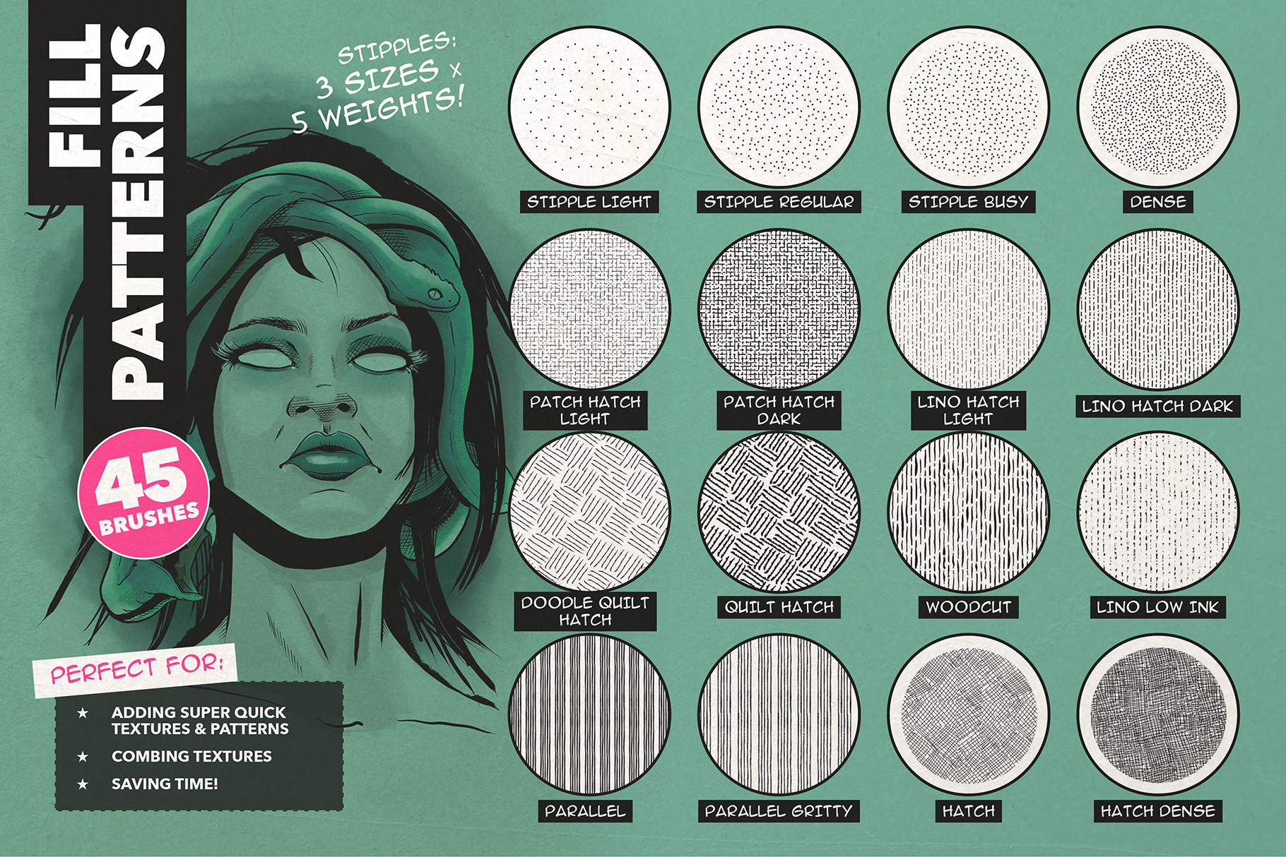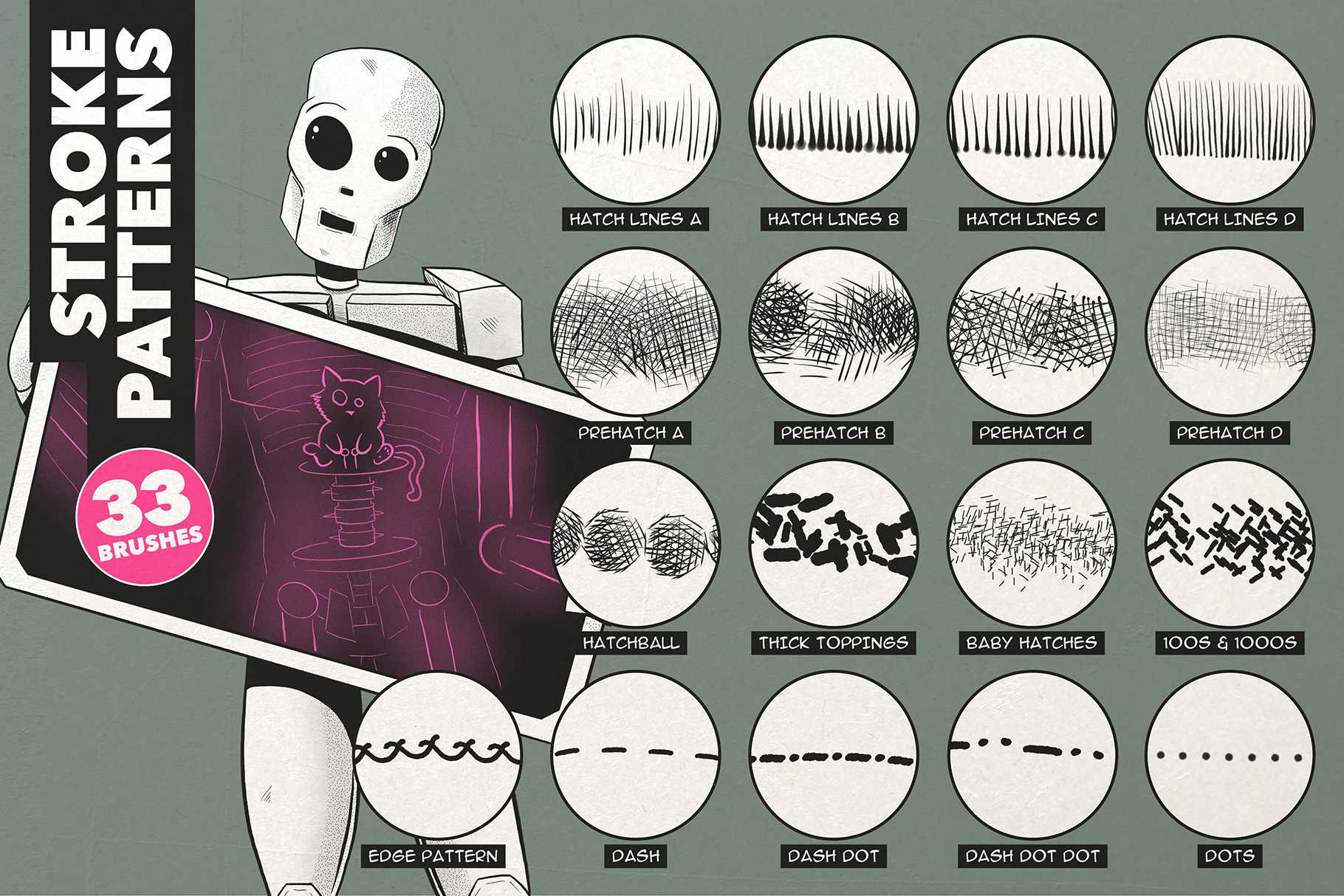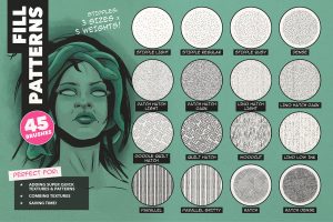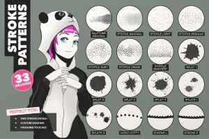 A bumper set of timesaving stoke patterns, including halftone and stipples (both pressure sensitive!), splats, stamps, edges, dashes, dots and more.